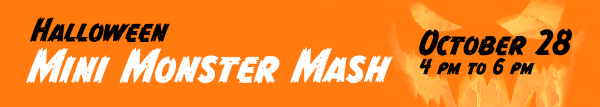 Join us Tuesday, October 28 from 4 pm – 6 pm for our Mini Monster Mash—an evening filled with treats, activities, and Halloween fun.