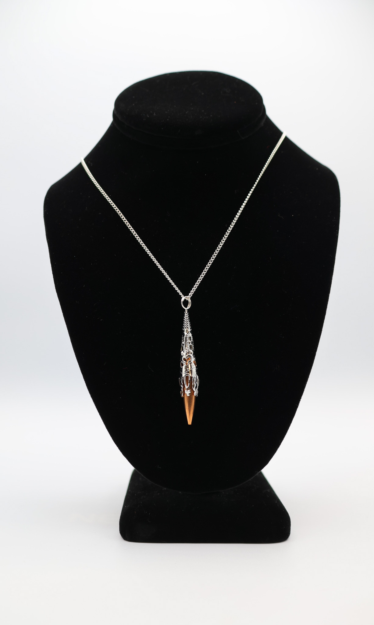 Our signature necklace- a full 7mm copper bullet hand wrapped delicately with silver filigree on a 24 inch sterling silver chain.