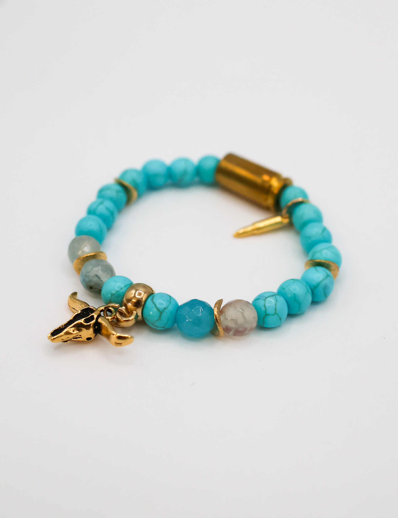 A turquoise howilite beaded bracelet with a gold plated stag charm and faceted quartz accent beads on a 1mm strong elastic with a real previously brass bullet casings .