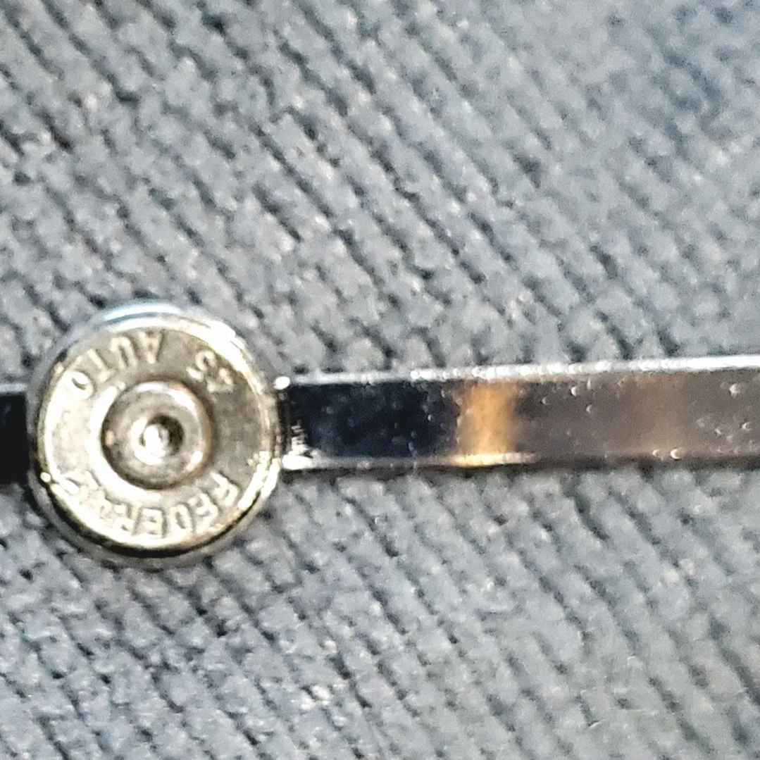 $58.00 3 en stock quantité de Tie Bar Clip Ajouter au panier UGS : Tie Clip Bullets n Beads Catégorie : Jewelry Silver tie bar clip with a 45 auto rim – previously fired. Magasinez Partager Partager Partager